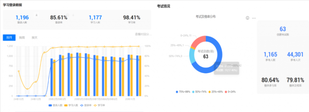 为提升学习积极性,江苏大众医药也建立了配套激励机制:将员工学习时长、考试成绩作为参考,在年底统一做评优,形成 “比学赶超” 的良好氛围。目前,江苏大众医药员工登录平台率85%以上,考试合格率稳定在 80%,学习效果显著。